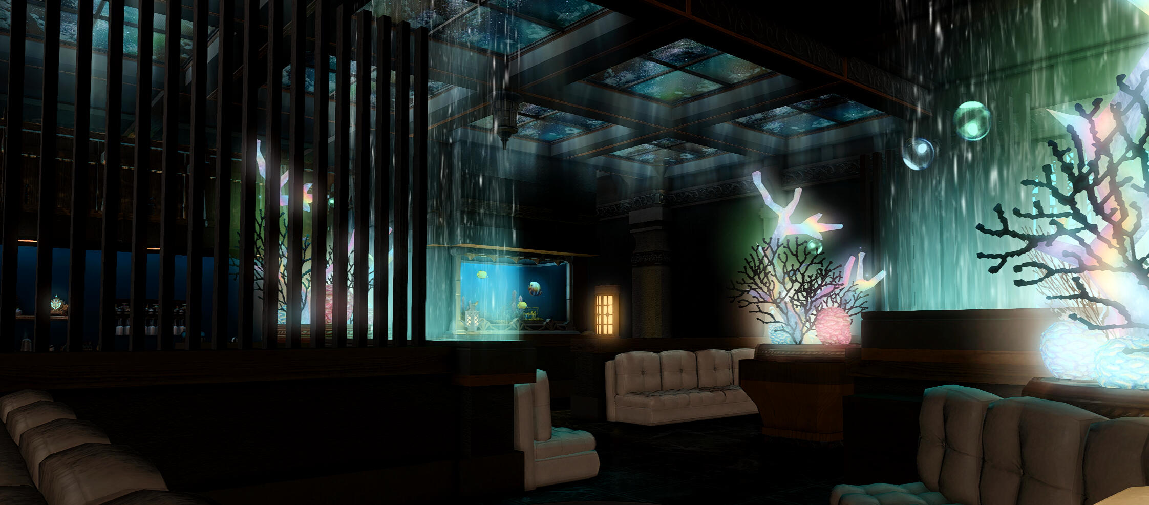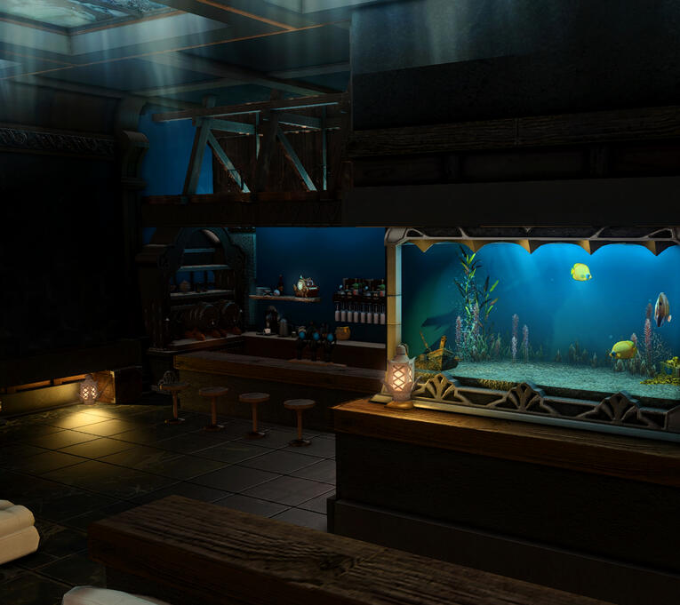 ⸻ ❝ The upper floor is open-concept, evoking the dark expanse of the abyssal plain. Fanciful growths of coral and wood are placed to nod to both the beauty of the sea and the many shipwrecks that lay in repose in the watery depths. ❞ ⸻