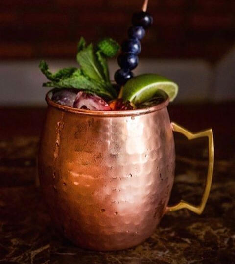 Vodka, muddled blueberries, and ginger beer. Garnished with blueberries, lime, and a sprig of mint. Can be made non-alcoholic.