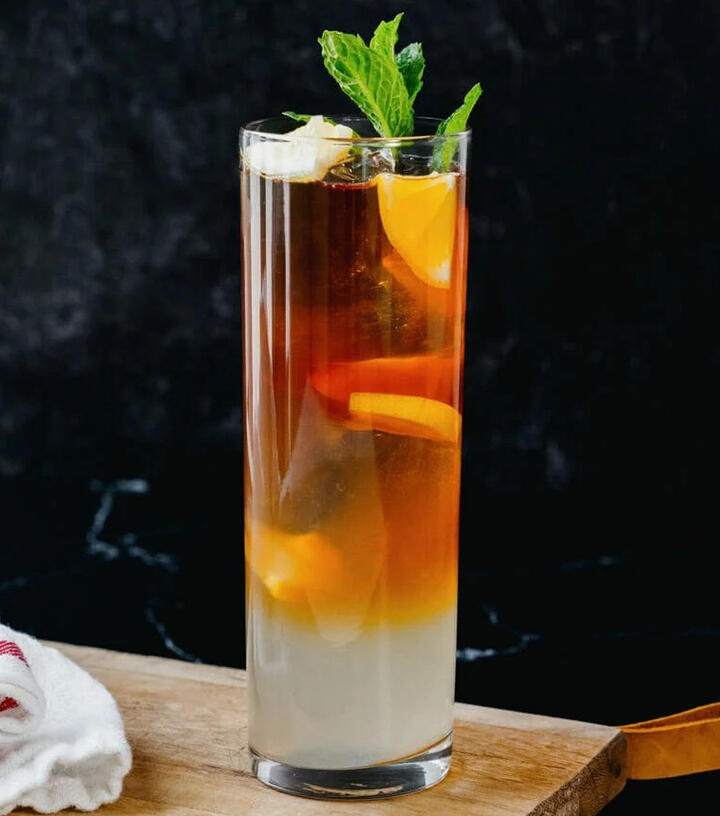 Treespeak cinnamon tea and mellow honey lemonade, layered in a tall glass and garnished with an orange slice. Non-alcoholic, but maple-aged bourbon can be added.