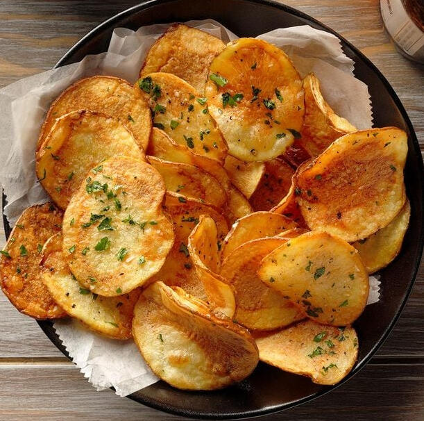 Crispy fried popoto chips, sprinkled with sea salt and chives. The perfect salty snack to go with any drink.