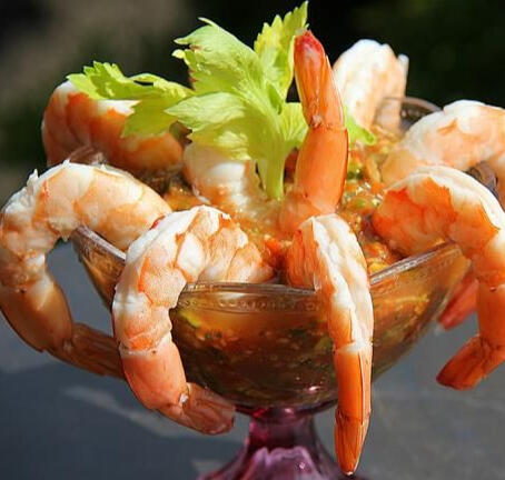 Shrimp gently poached with lemon and herbs and served in a glass with a zingy, piquant sauce.
