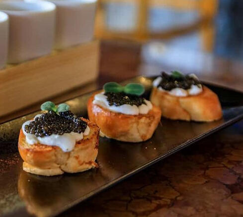 Ilsabard sturgeon caviar with cream cheese, tomato and red onion on golden toasts, garnished with baby basil.